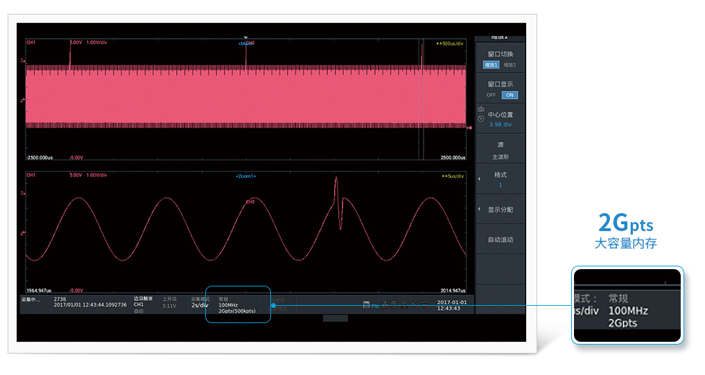 示波记录仪内部设有高稳定性温度补偿的100MHz同步时钟,避免了温度带来时钟漂移所引入的测量误差。同时也保证了每一个通道ADC的采样相位同步,减少了测量时通道间相位角所引入的误差,误差在3ns以内,保证所有通道信号同步测试。